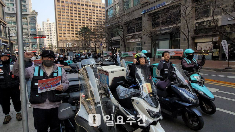 ▲민주노총 배달플랫폼노조 북서울지부는 20일 오후 3시 서울 마포구에 위치한 공덕B마트 앞에서 기자회견을 열고 라이더에게 지급하는 기본배달료 인상을 촉구했다.(사진=일요주간DB)