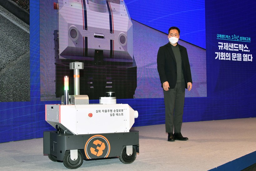 ▲지난 2일 서울 세종대로 대한상의에서 열린 규제샌드박스 2주년 성과보고회에서 김진효 도구공간 대표가 규제샌드박스 실증특례를 부여받은 실외자율주행 순찰로봇 '패트로버'를 소개하고 있다.(사진=newsis) |