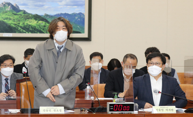 | ▲지난해 11월 서울 여의도 국회 본청 환경노동위원회 회의실에서 열린 환경노동위의 '특수형태근로 종사자 보호방안 마련을 위한 입법 공청회'에서 진술인으로 나온 권오성 교수(성신여대 법대,왼쪽)가 회의 시작전에 인사하고 있는 모습이다.(사진=newsis) |