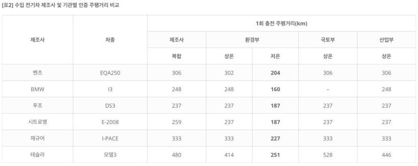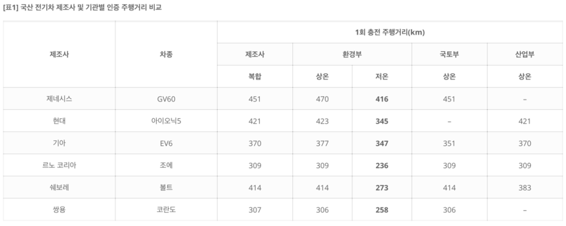 전기차를 관리하는 국토부, 산업부, 환경부도 대부분 상온 주행가능거리만 표기하고 있는데, 이마저도 서로 상이해 소비자 혼란만 가중시키고 있는 것으로 나타났다.