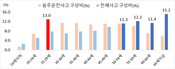 교통사고는 50대 이상 운전자에 의한 사고 비중이 높았으나, 음주운전사고에서 만큼은 20대 후반(25~29세) 운전자에 의한 사고가 13%로 가장 많은 것으로 나타났다.
