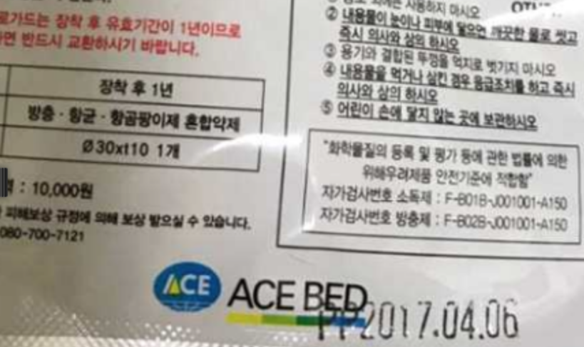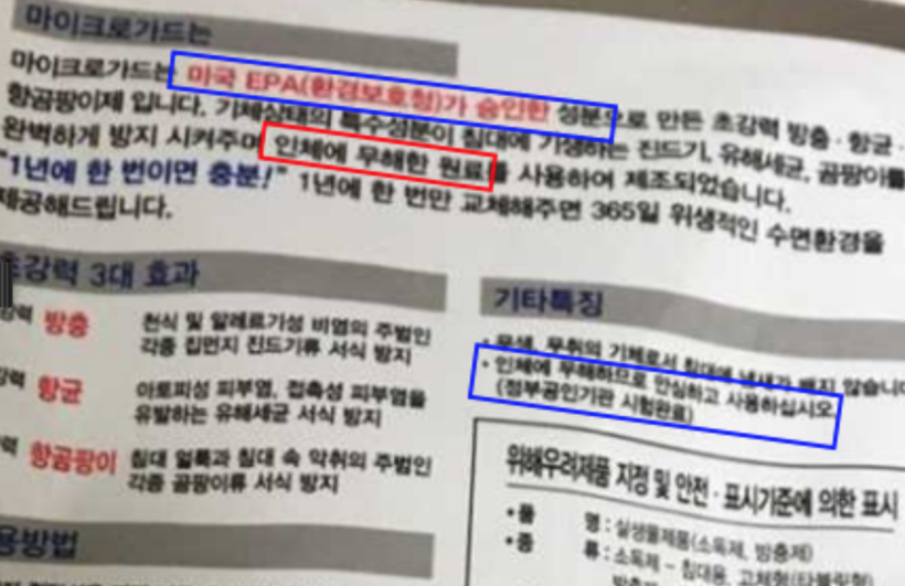 문제가 된 제품은 에이스침대가 2016년 11월부터 2018년 6월까지 자사 매트리스에 부착해 판매한 침대용 소독·방충제 ‘마이크로가드’. 회사 측은 해당 제품 포장에 ‘인체에 무해한 원료로 제조’, ‘미국 EPA 승인 성분’, ‘정부공인기관 시험완료’ 등의 문구를 강조했다.