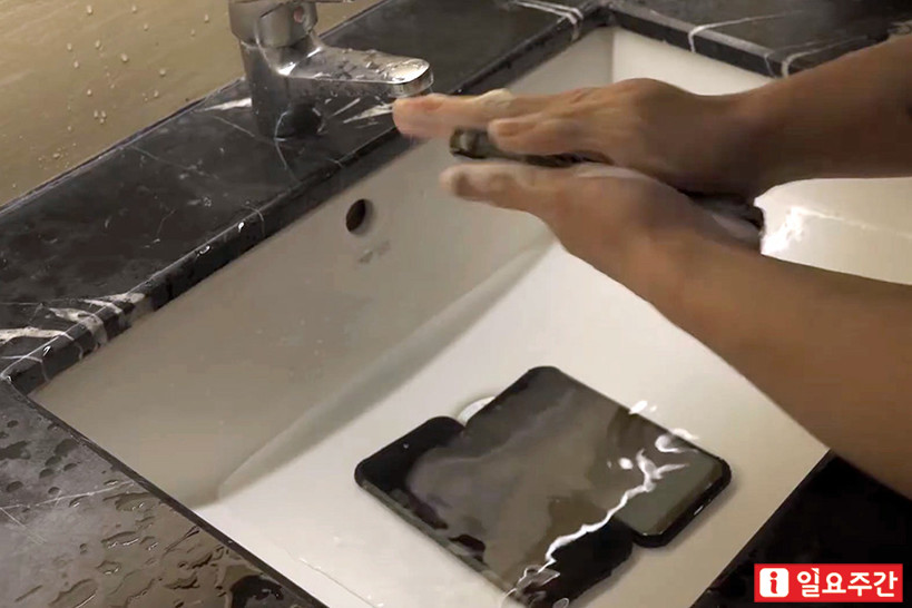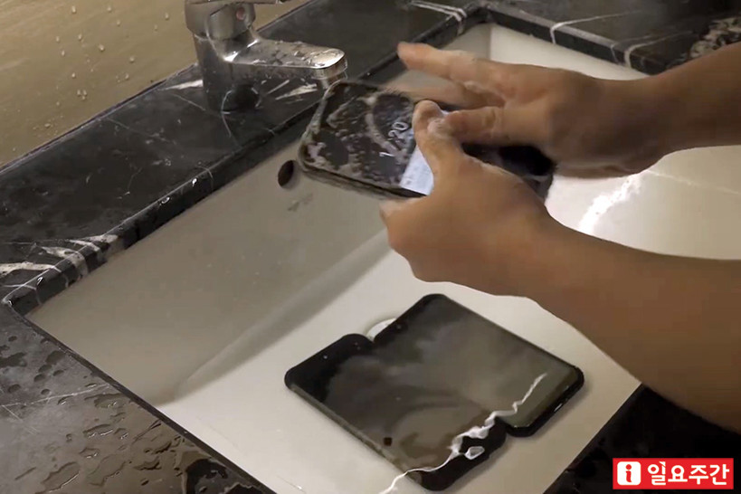 영상에는 75% 알콜을 뿌리고 소독하는 장면이 나왔고 세면대에 물을 받아두고 3개의 폰을 차례로 비누질해서 손으로 거품낸 후 씻어내는 장면이 연출되었다. 일반 폰이라면 엄두도 내지 못할 모습은 방진 방수를 기본으로 제공하며 특수한 케이스를 통해 걱정거리를 덜어낸 러기드폰만의 매력이 물씬 풍겨나왔다.