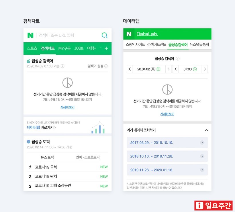 [일요주간 = 이수근 기자] 네이버는 4·15 총선의 공식 선거 운동이 시작되는 2일부터 투표 당일인 오는 15일 오후 6시까지 급상승검색어 서비스 운영이 중단된다고 발표했다. 오타 혹은 잘못 알고 있는 검색어를 입력했을 때 올바른 단어를 추천해 주는 ‘검색어 제안’ 기능 역시 중단됐다. 두 기능 모두 선거가 종료되는 4월 15일 오후 6시에 다시 활성화될 예정이다.