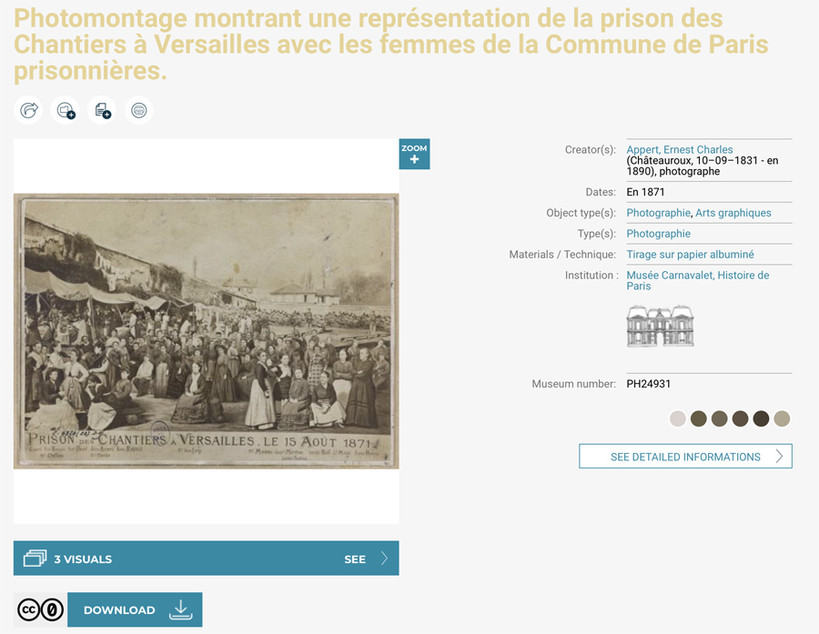 파리스 뮤제는 이 콜렉션 포털 사이트에 300DPI의 고화질의 파일을 제공하며, 각 파일에 작업에 대한 세부 정보와 해당 이미지 사용례의 모범 가이드를 다운로드할 수 있도록 서비스한다. 전체 소장품은 공공의 영역이라는 해석을 강조하며, 대중들이 쉽고 유용하게 쓸 수 있도록 한다고 배포 이유를 밝혔다.