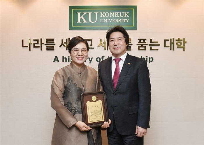 ▲ 건국대 총장시절 한세연 오양심 이사장과 함께 |
