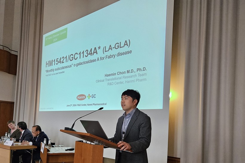 ▲ 한미약품 R&D센터 임상이행팀 전해민 이사(M.D., Ph.D)가 최근 독일 함부르크에서 열린‘Update on Fabry Disease 2024’에서 파브리병 치료제 ‘LA-GLA’의 최신 연구 성과를 발표하고 있다. (사진=한미약품 제공) |