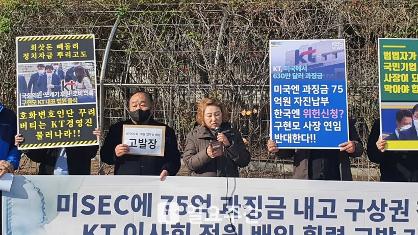 그러면서 “더욱 기가 막힌 것은 범법자 구현모는 KT 사장직을 다시 한 번 연임하겠다고 선언했으며 아무런 견제역할을 하지 않았던 이사회는 구현모 사장 연임 심사에 돌입했다”며 “이러한 구현모 사장과 KT 이사회의 행태야말로 전 국민의 양심에 대한 정면 도전이라 하지 않을 수 없다”고 개탄했다.