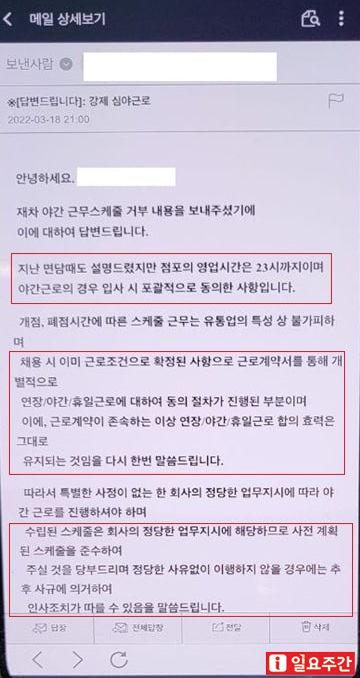| ▲야간 근로 거부 의사를 밝히자 이마트가 회신한 메일 답변. <사진=마트노조 이마트 지부 제공> |
