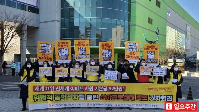 | ▲마트노조 이마트지부 서울본부는 지난 1월 12일 심야근로실태 폭로 기자회견을 열고 노동자의 건강권과 저녁 있는 삶 보장을 근거로 10시 폐점 시행을 촉구했다. <사진=이마트 지부 서울본부 제공> |