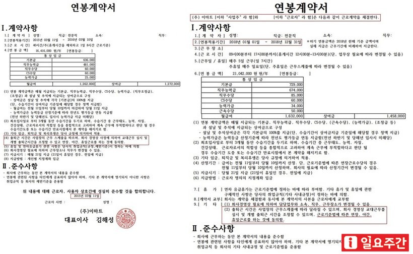 | ▲이마트는 2014년까지 매년 연말 또는 연초에 사원별로 연장, 야간, 휴일근로에 대한 개별 동의를 받아 왔으나 2015년부터 연봉 계약서에 추가 근로에 동의한다는 문구를 추가했다. <사진=민주노총 서비스연맹 마트노조 이마트 지부 제공> |