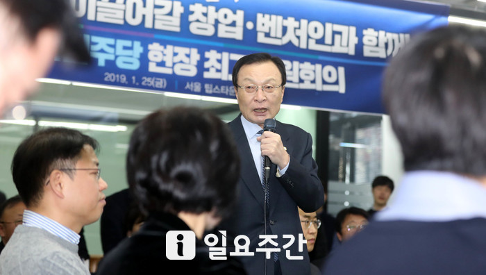 ▲ 혁신성장을 이끌어갈 창업 벤처인과 서울 강남구 팁스타운에서 이해찬 더불어민주당 대표가 모두발언을 하고 있는 모습. |