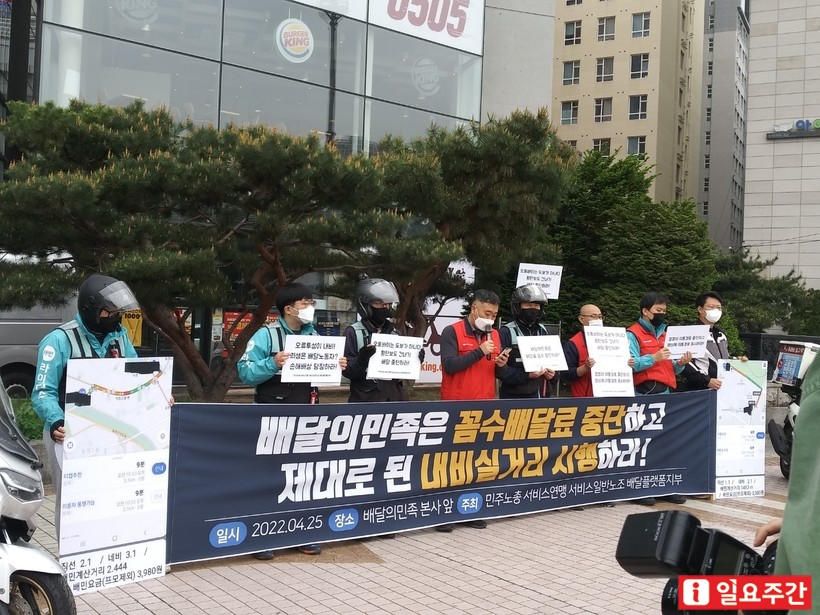 민주노총 서비스연맹 서비스일반노조 배달플랫폼지부는 25일 서울 송파구 배달의민족 본사 앞에서 기자회견을 열고 “배민은 꼼수배달료 중단하고 제대로 된 내비실거리를 시행하라”고 촉구했다.