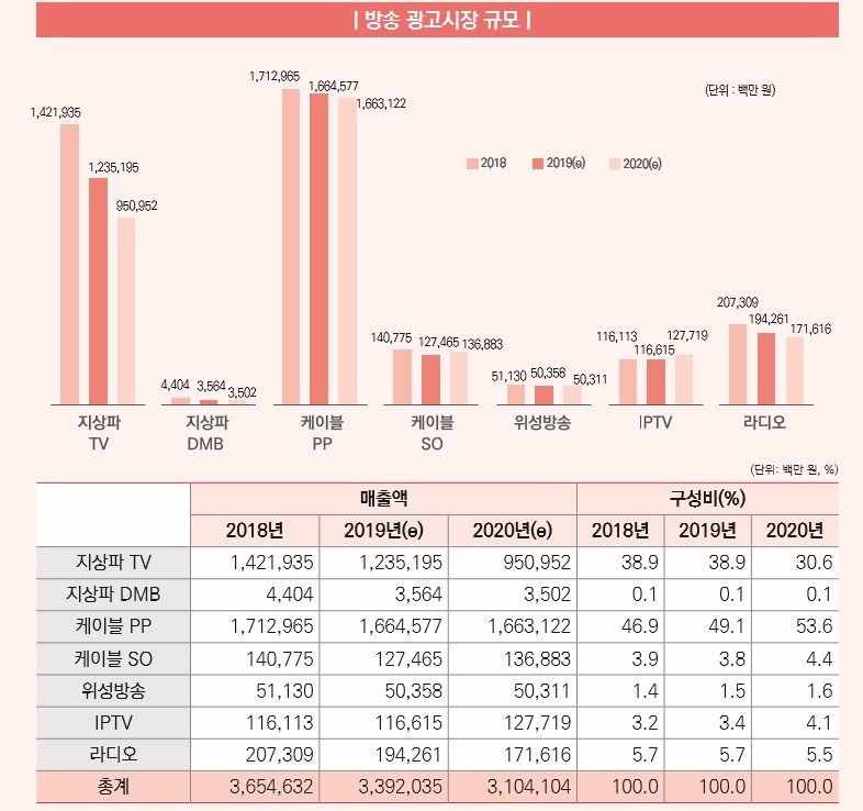 전체 방송광고비의 85.8%의 비중을 차지하는 지상파TV(38.9%)와 케이블PP(46.9%)의 광고비가 모두 전년대비 각각 8.4%, 7.6% 감소한 1조 4219억 원, 1조7130억 원으로 조사됨으로써, 전체 방송광고비 감소의 주요 요인으로 분석됐다. 반면 IPTV(1161억, 16.9%↑), 위성방송(511억, 6.6%↑), 케이블SO(1408억, 1.2%↑)의 광고매출액은 전년대비 증가했다.