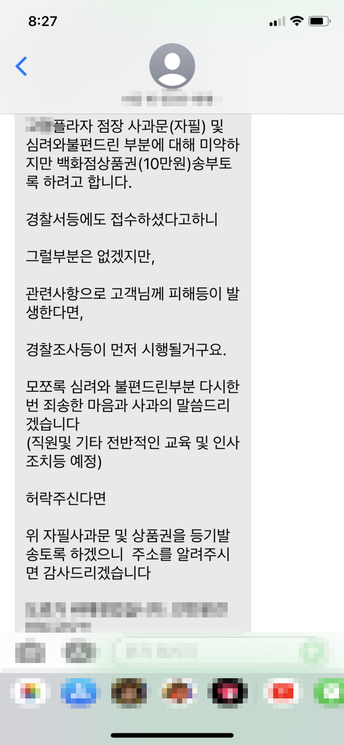 ▲명의변경 서비스를 처리한 KT 모 지점 점장이 A 씨에게 보낸 사과문이다. KT 측은 A 씨에게 사과의 의미로 상품권 10만 원을 제공하겠다고 했지만 A씨는 이를 거절했다.(사진=제보자 제공) |