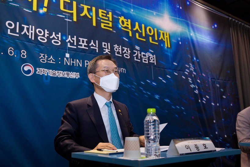 ▲이종호 과학기술정보통신부 장관이 8일 오전 경기도 성남시 분당구 NHN에서 열린 '민관협력 디지털 인재양성 선포식 및 간담회' 에 참석해 인사말을 하고 있다. (사진=과학기술정보통신부 제공) |