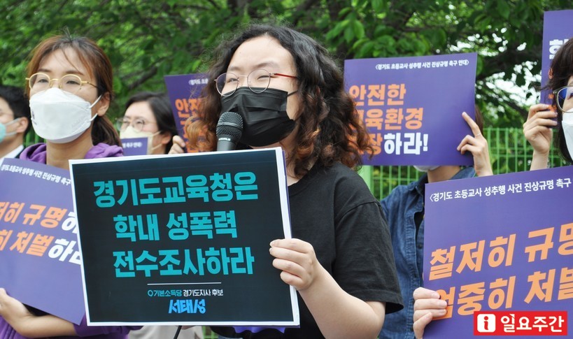 ▲ 기본소득당 경기도의회 의원 비례대표 양지혜(26) 후보가 지난 13일 경기도 수원시 장안구 경기도교육청 남부청사 앞에서 초등학생을 강제 추행한 교사에 대한 징계와 진상 규명을 촉구하는 기자회견에 참석해 발언자로 나섰다. <사진=성지온 기자> |
