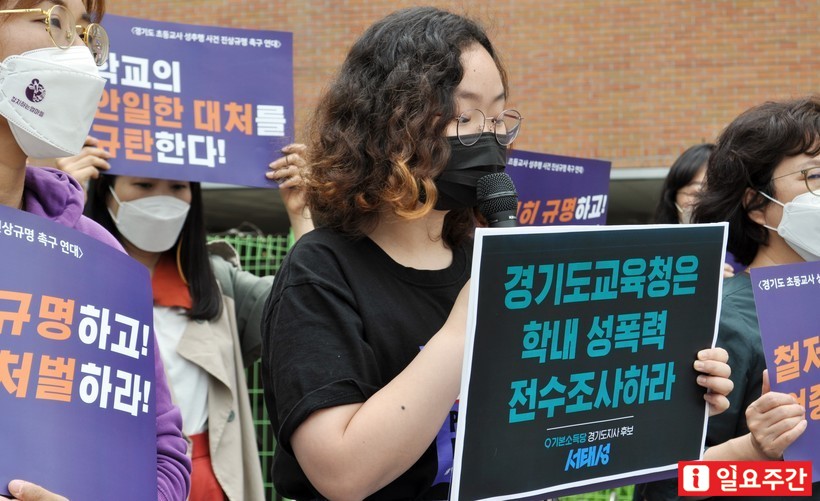 지난 13일 위 사건의 가해 교사에 대한 징계와 진상 규명을 요구하는 여성·시민사회단체의 기자회견이 경기도 수원시 장안구 경기도교육청 남부청사 앞에서 열렸다. 이날 발언자로 참석한 기본소득당 경기도의회 의원 비례대표 양지혜(26) 후보는 이번 사건에 대해 “‘스쿨 미투’ 고발 이후 4년이 흘렀지만 조금도 바뀌지 않았다”라고 한탄했다.