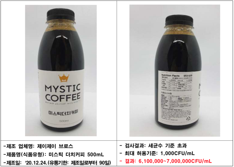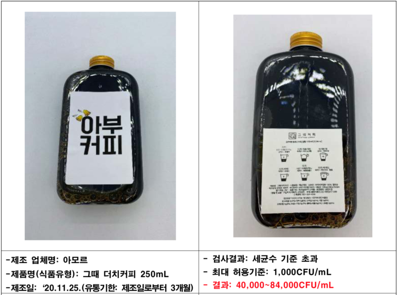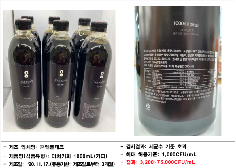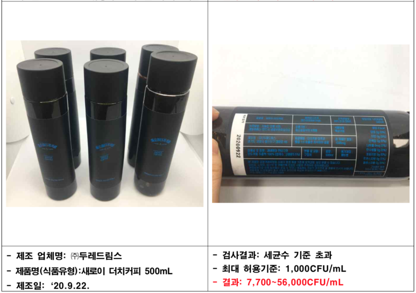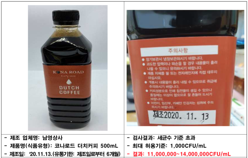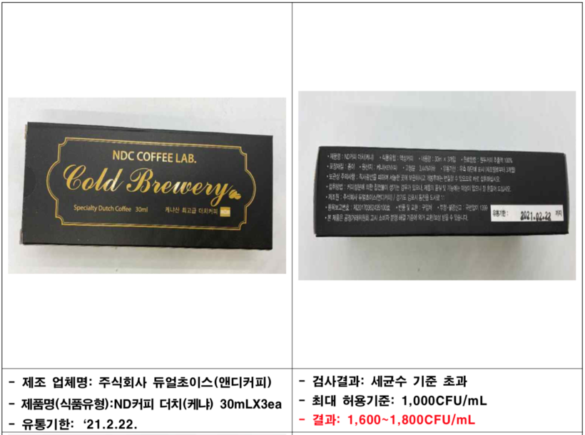 식약처에 따르면 지난해 12월부터 2월 5일까지 인터넷 판매 더치커피를 중심으로 수거·검사를 실시했다. 그 결과 더치커피 7개 제품에서 세균수 최대 허용기준치인 1000CFU/mL를 초과 검출(1600~1400만CFU/mL)돼 행정처분 및 부적합 원인조사를 실시했다.