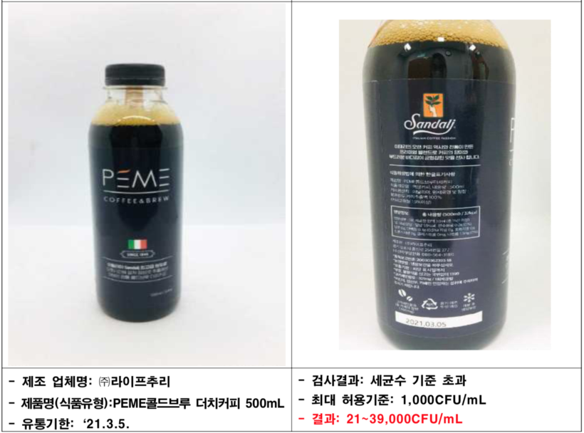 식품의약품안전처(처장 김강립, 이하 식약처)는 이들 제품을 수거해 세균수와 대장균군을 검사한 결과 세균수가 기준을 초과한 제품에 대해 판매 중단 및 폐기조치했다고 18일 밝혔다.