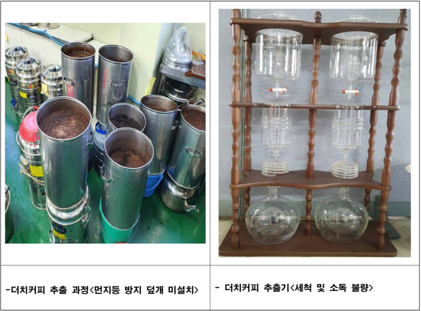 A업체의 경우 작업장 바닥과 벽면에 찌든 때가 끼어 있고 더치커피를 추출하는 기구(용기, 노출) 등에도 커피 찌꺼기가 눌러 붙어 있는 등 위생관리 소홀로 확인돼 ‘작업장 환경개선’과 ‘기구 등 세척공정 개선’ 등을 조치했다.