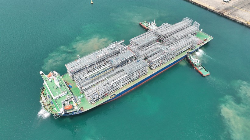 ▲ DL이앤씨 텍사스 석유화학 플랜트 현장에 설치될 총 18개, 무게 4,264톤 규모의 플랜트 모듈이 베트남 중꾸엇(Dung Quat)에서 출항하고 있다. (사진=DL이앤씨 제공) |