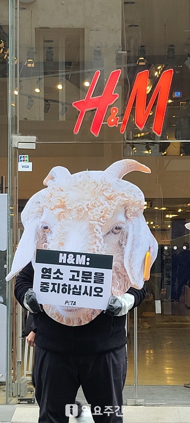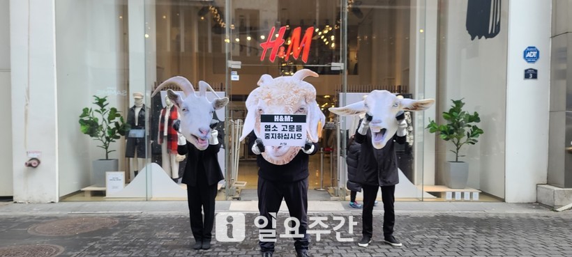 ▲동물보호단체 PETA는 28일 서울 중구에 위치한 의류기업 H&M 매장 앞에서 모헤어와 캐시미어 제품 판매를 하지 않겠다고한 약속을 철외한 H&M을 규탄하는 집회를 열었다.(사진=김상영 기자) |