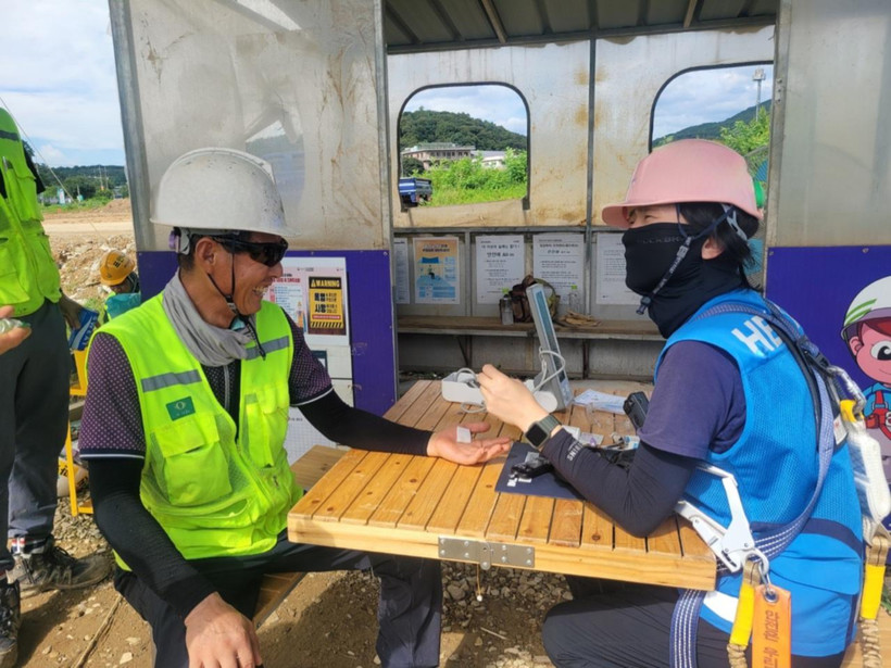 ▲ DL이앤씨 현장 안전·보건관리자(우측)가 오후 TBM 시 근로자 건강상태를 살펴보고 있다. (사진=DL이앤씨 제공) |