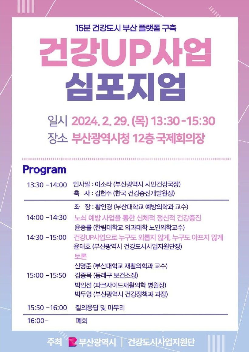 [일요주간=김영란 기자] 부산시(시장 박형준)는 지난 2월 29일 오후 2시 시청 국제회의장에서 건강업(UP) 사업 심포지엄을 개최했다고 밝혔다.