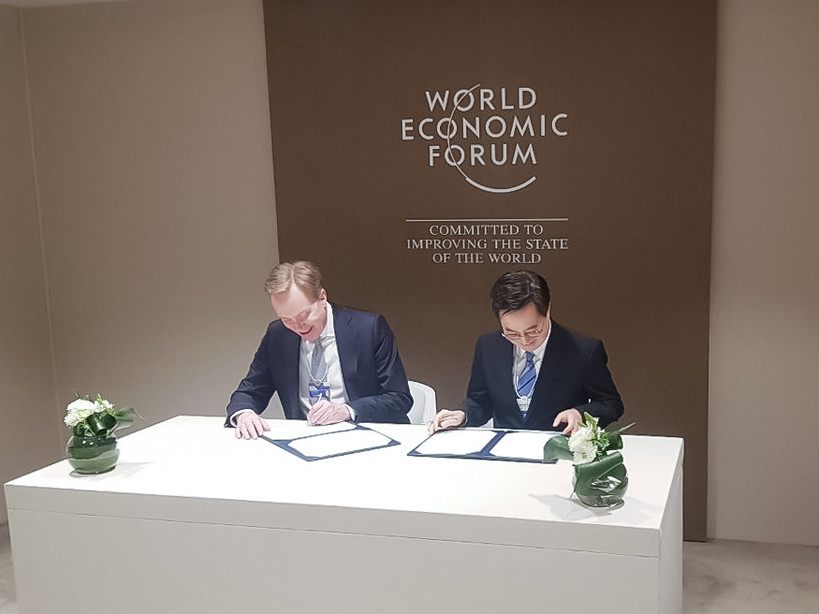 ▲ 현지시간 15일 오후 스위스 다보스포럼에서 김동연 경기도지사가 보르게 브렌데(Børge Brende) 세계경제포럼 이사장과 4차산업혁명센터 설립을 위한 업무협약을 체결하고 있다. (사진=경기도) |