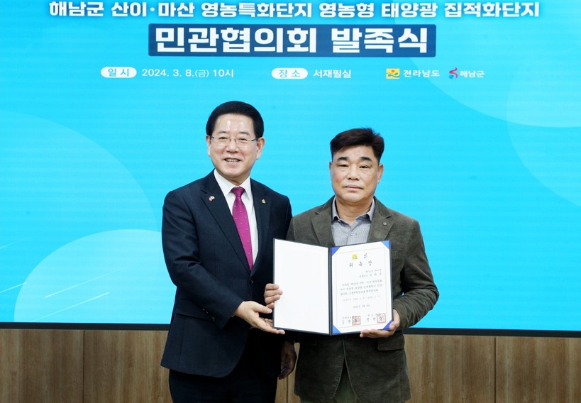 [일요주간=김영란 기자] 전라남도는 8일 초대형 영농형 태양광의 국내 첫 사례가 될 ‘산이·마산 영농특화단지 영농형 태양광 집적화단지’ 조성을 위한 민관협의회를 발족했다고 밝혔다.