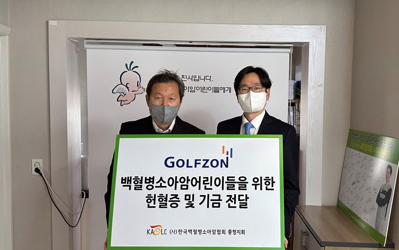 골프존은 26일 (사)한국백혈병소아암협회 충청지회(회장 박우성)를 찾아 소아암 투병 어린이들을 위한 기부금 2000만 원과 골프존뉴딘그룹 임직원들이 자발적 참여로 모은 헌혈증서 100여 장을 전달했다.