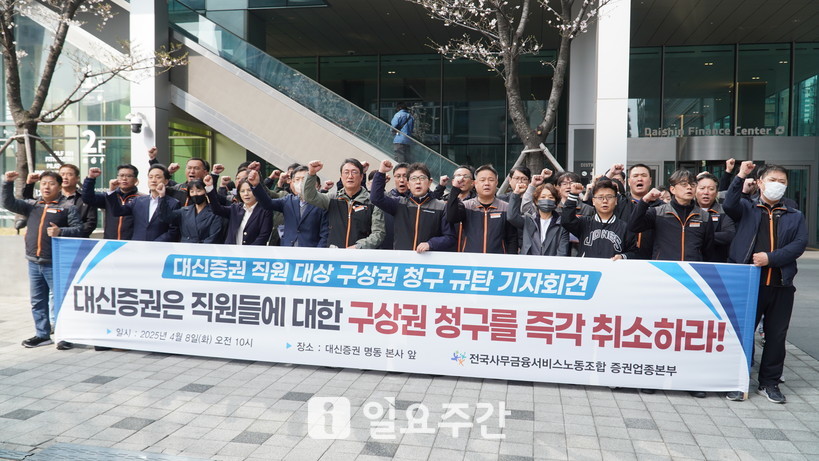 [일요주간 = 김완재 기자] 지난 8일 전국사무금융서비스노동조합(위원장 이재진, 이하 사무금융노조) 증권업종본부(본부장 김기원)는 라임펀드 사태와 관련해 대신증권이 판매 직원을 상대로 구상권을 청구한 것에 대해 강하게 규탄하는 기자회견을 개최했다. 이날 기자회견에는 사무금융노조, 라임펀드 피해자 대책위원회, 대신증권지부 관계자 등이 참석, 경영진의 책임 전가를 비판하고 구상권 청구 철회를 촉구했다.