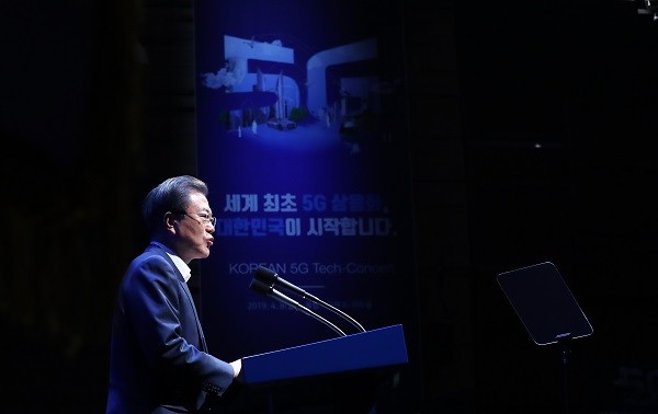 ▲ 문재인 대통령이 8일 서울 송파구 올림픽공원 K-아트홀에서 열린 코리안 5G 테크 콘서트 '세계 최초 5G 상용화, 대한민국이 시작합니다'에서 기념사하고 있다.(사진=newsis) |