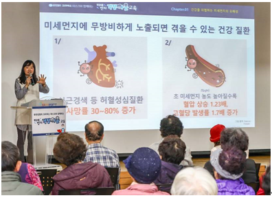 올해 ‘미세먼지 걱정 아웃 교실’은 교육 횟수를 기존 8회에서 14회로 늘리고, 수혜 대상을 미세먼지 취약계층이자 관련 교육의 기회가 부족한 시니어층으로 확대한다. 환경강사가 신청 기관에 방문해 대상의 눈높이에 맞는 다양한 시청각 자료를 활용한 교육을 통해 △미세먼지가 건강에 미치는 영향, △미세먼지 경보 시 대응 방법, △올바른 황사 마스크 착용법 등을 소개할 예정이다.