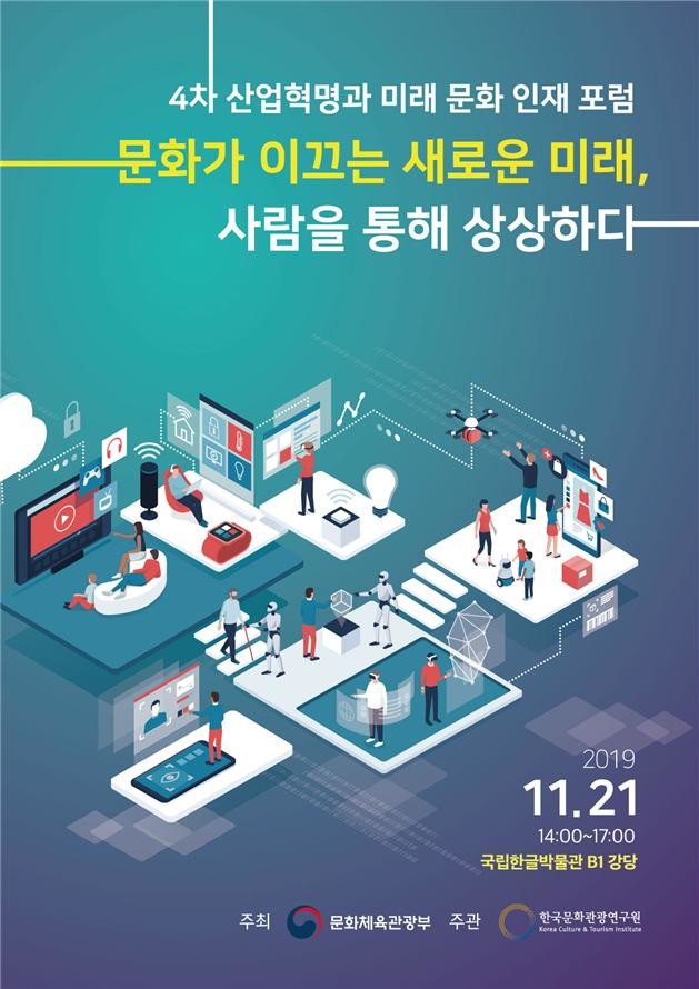 문화체육관광부(장관 박양우, 이하 문체부)는 한국문화관광연구원과 함께 오는 21일 오후 2시 국립한글박물관에서 ‘4차 산업혁명 시대의 새로운 문화 인재 육성을 위한 정책 방향’을 주제로 인재 포럼을 개최한다고 19일 밝혔다.