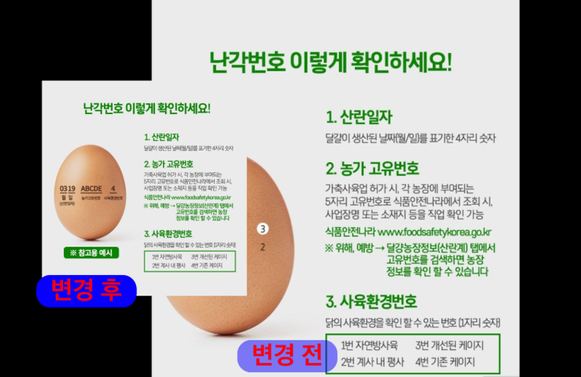 정부는 지난 2017년 달걀에서 살충제 성분이 검출돼 논란이 된 이후 소비자들의 안전을 위해 달걀에 의무적으로 난각번호를 표기하도록 했다. 이 중 맨 마지막 한자리 숫자는 사육환경을 표기한 것으로 1번(자연방사육), 2번(계사 내 평사), 3번(개선된 케이지), 4번(기존 케이지)으로 등급을 분류했다. 숫자가 낮을 수록 건강한 환경에서 자란 닭이 낳은 달걀로 볼 수 있다.