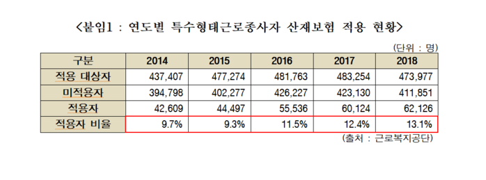 신창현 더불어민주당 의원이 근로복지공단으로부터 제출받은 자료에 따르면 최근 5년간 특수근로자 산재보험 가입률은 ▲2014년 9.7% ▲2015년 9.3% ▲2016년 11.5% ▲2017년 12.4%, 지난해 13.1%로 연평균 11.2% 수준에 그친 것으로 나타났다.