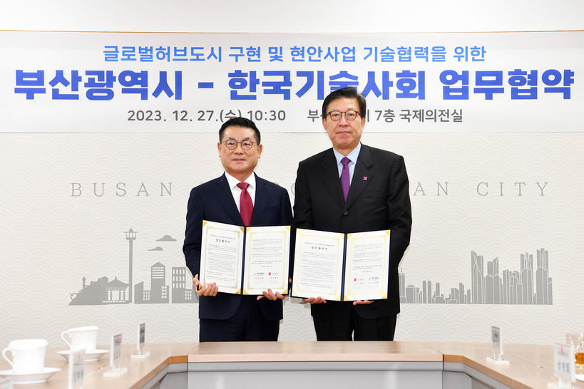 [일요주간=김영란 기자] 부산시(시장 박형준)는 오늘(27일) 오전 10시 30분 시청 국제의전실에서 한국기술사회(회장 장덕배)와 「글로벌허브도시 구현 및 현안사업 기술협력을 위한 업무협약」을 체결한다고 밝혔다.