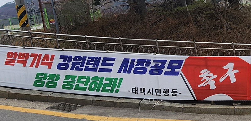 | ▲ 14일 태백시청 인근 도로변에 태백시민행동이 부착한 강원랜드 사장 공모 즉각 중단촉구 현수막. (사진=태백시민행동 제공) |