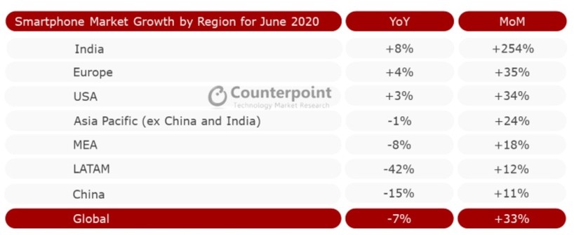 ▲ 2020년 6월 지역별 스마트폰 시장 전년 동기 및 전월 대비 증감율 (출처=카운터포인트리서치) |