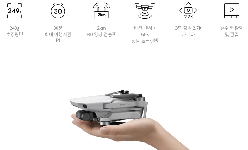 이번 출시된 매빅 미니는 DJI가 그간 내놓은 드론 중 가장 작고 가벼운 모델로 동급 기종 드론 중에서는 비행시간이 30분으로 가장 길다.