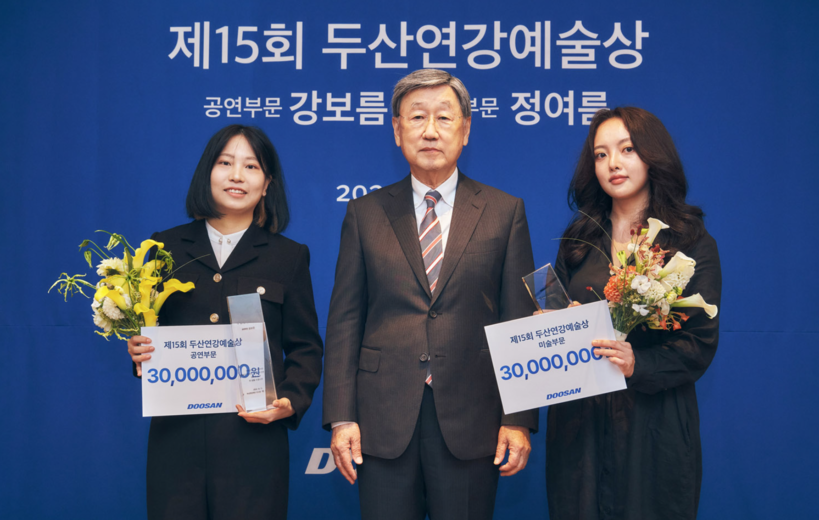 ▲ ‘제15회 두산연강예술상’ 시상식에서 두산연강재단 박용현 이사장(가운데)과 공연부문 수상자 강보름 연출가(왼쪽), 미술부문 수상자 정여름 작가(오른쪽)가 기념사진을 촬영하고 있다. (사진=두산그룹 제공)
