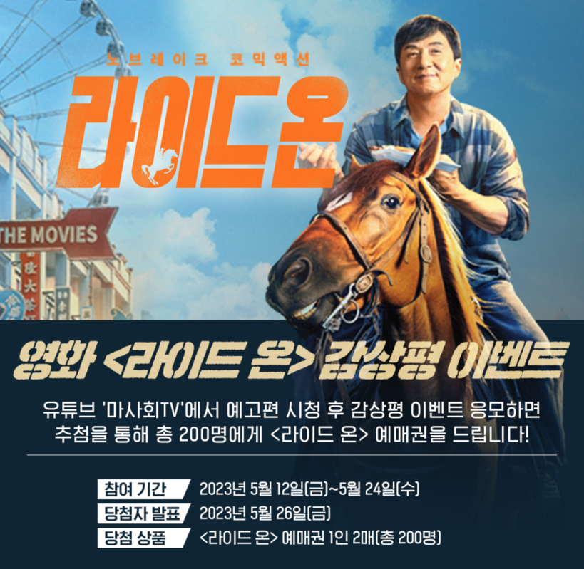 이달 31일 개봉 예정인 성룡 주연의 영화 ‘라이드 온’ 예고편을 시청한 후 감상평 이벤트에 응모하면 추첨을 통해 1인당 2매씩, 총 200명에게 예매권 행운이 돌아갈 예정이다. 해당 이벤트의 응모기간은 12일부터 24일까지이며 당첨자는 26일 발표한다.