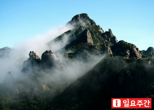 | ▲ 운무에 싸인 신령스러운 월출산 천황봉. 陰의 이름을 가진 월출산이지만, 산 정상은 불꽃모양인 陽의 모습이다 |