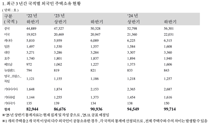 실제로 강민국 의원실이 국토교통부로부터 제출받은 <최근 3년간 외국인 주택·토지소유 등 현황> 에 따르면 외국인의 국내 주택소유 규모는 ▲ 2022년 하반기 8만 2944호 ▲ 2023년 상반기 8만 6676호 ▲ 2023년 하반기 9만 936호 ▲ 2024년 상반기 9만 4549호 ▲ 2024년 하반기 9만 9714호로 꾸준히 증가 추세를 보이고 있다.