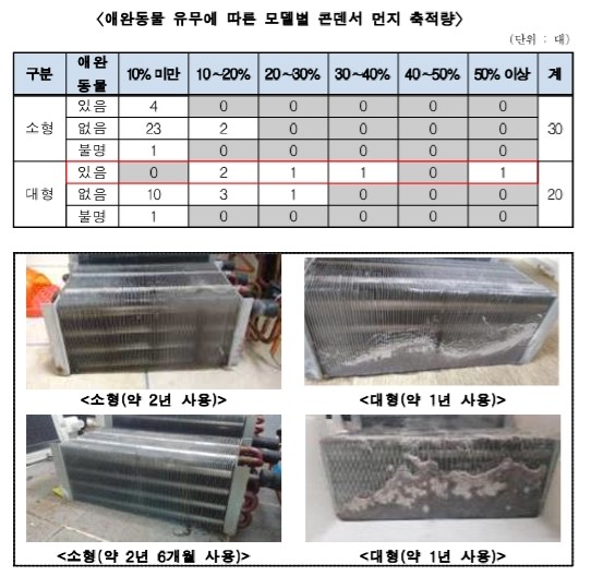 애완동물이 있으면서 소형건조기를 사용하는 4가구의 먼지 축적량은 모두 10% 미만이었다. 그러나 애완동물이 있으면서 대형건조기를 사용하는 5가구의 경우 먼지 축적면적이 모두 10% 이상이었으며 그 중 1가구는 먼지 축적량이 50% 이상인 것으로 확인됐다. 소비자원은 주로 애완동물의 털이 먼지와 섞여 축적돼 있는 상태임을 육안으로 확인했다고 전했다.