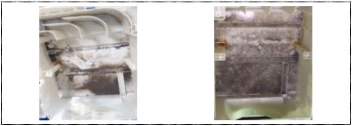 ▲ 세척에 활용된 잔류 응축수가 콘덴서 하단에 고여 곰팡이 등 발생 가능.(제공=한국소비자원) |