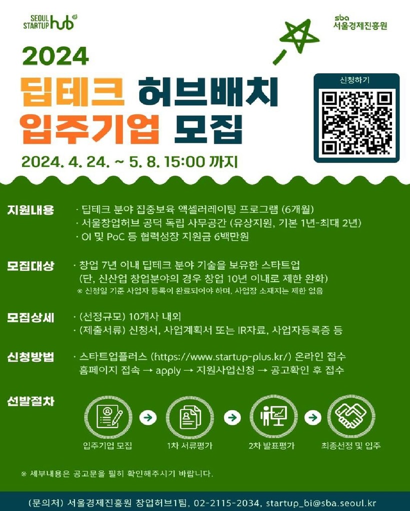지원대상은 창업 7년 이내 딥테크 기술 보유 기업(신산업 분야는 창업 10년 이내)이며, 참가를 희망하는 기업은 스타트업 플러스(https://www.startup-plus.kr/)를 통해 5월 8일(수) 15시까지 온라인 신청서를 제출하면 된다.