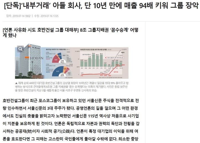 이후 서울신문은 지난 15, 16일자 기사에서 “‘내부거래’아들 회사, 단 10년 만에 매출 94배 키워 그룹 장악’”, ‘호반건설, 8조 그룹지배권 ‘꼼수 승계’”, “호반건설, 문어발식 M&A ‘富의 편법 대물림’”, “작년 건설업 투자 고작 10억...차남 회사 주식은 2283억어치 샀다” 총 4개 기사로 2000년대 초반부터 계열사가 총동원돼 김상열 회장의 첫째 아들인 김대헌(32) 부사장의 회사를 키워온 흔적을 보도했다.